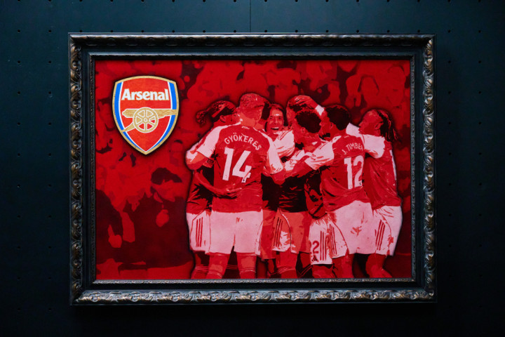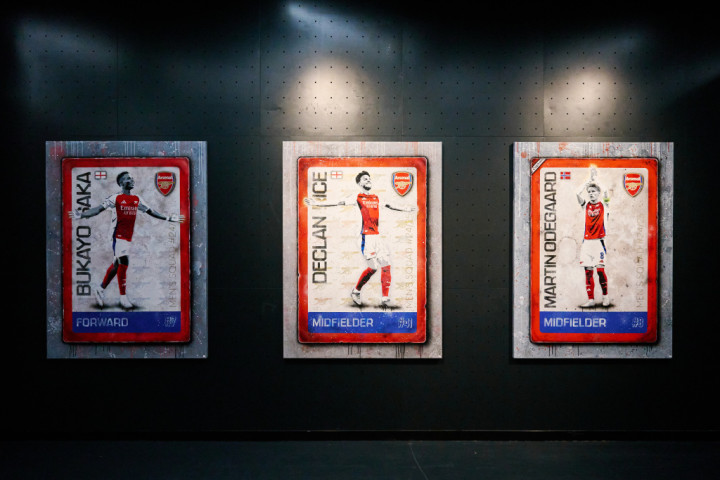 球员系列则聚焦于阿森纳故事中个体的力量,是通盘展览中最能焚烧个东说念主挂牵的部分。厄德高的灵光、赖斯的强项、萨卡的矛头,还有传说队长亚当斯穿越时光而来的铁血风骨,都以充满生命力的格式在画布上奔腾。艺术家的创作并未追求写实肖像,而是捕捉每位球员唯独无二的“气场”,通过动作、色调与动态线条传达厚谊印象与精神特色。其中,《保藏品》系列作品的视觉灵感,开端于怀旧作风的往返卡,将阿森纳现役球员与历史上的传说球员,鬈曲为可保藏的艺术一忽儿。