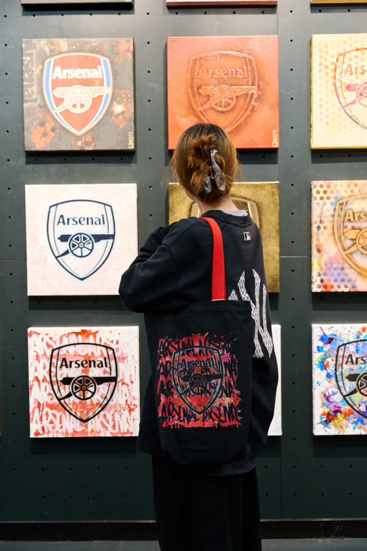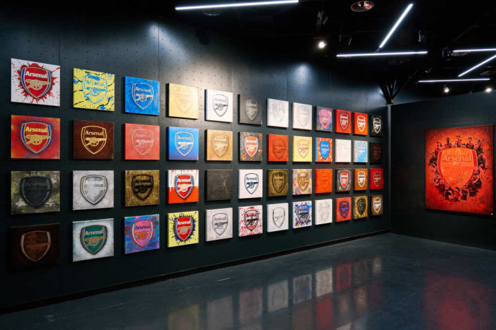 徽章系列既是致意,亦然再创。艺术家海登·波恩用他颠覆性的视觉言语,将千里甸甸的荣耀与挂牵,燃成不雅众咫尺流动的火焰。在徽章子系列作品中,最为震撼确当属《Arsenal》。它由48件小幅徽章作品搭配1件大幅徽章作品,共同构成“49”矩阵,在展厅墙面整都排布。“49”对阿森纳而言具有独特兴味,它象征着俱乐部在“无敌赛季”技艺创下的历史性合资不败记载,这一记载于今无东说念主突出。而《传承》《流行》《街头》《至极版》等子系列,则区别期骗岁月肌理、波普色调、街头涂鸦乃至中国祥云龙纹,为阿森纳徽章书写下跳跃时辰与文化的多重注脚。