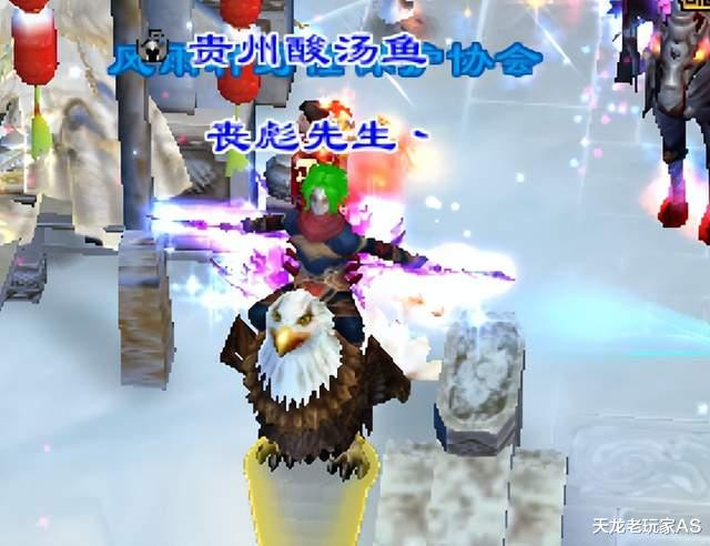 太不落俗套了!天山运转门派时装,搭配绿色杀马特发型,坐骑是走地鸡——啊不,陆行雕!