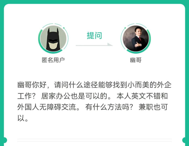 他要找小而好意思外企,什么目的?咱们看到,他主要说起了“居家办公”这个字眼,讲明这个学长是个宝妈师姐了。宝妈善于遐想,大大皆企业包括外企是不让居家办公的,亦然全职坐班,她想连合家赢利,但愿上班时刻越少越好,不坐班才好,是以她又补充了个“兼职也可以”。
