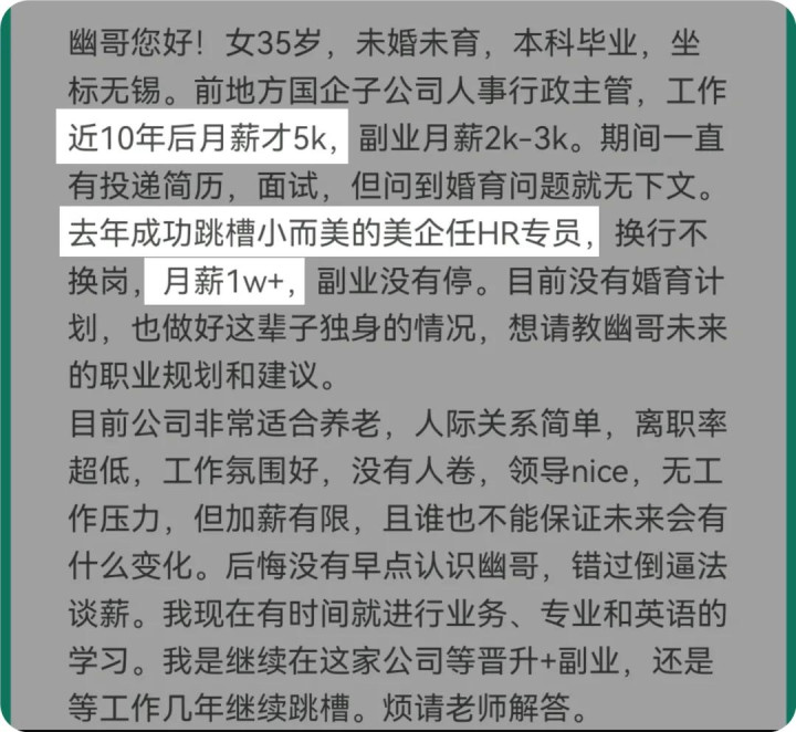 再看下一个小而好意思的诉求,此次不是宝妈,而是光棍师姐,有十年使命警告了。此次地点换到了无锡,这位星友在梓乡使命了或者11年目下35岁,光棍未育,本科学历。她在国企作念了十年,领路的穷,月薪5千拿了十年。她土产货东谈主,没啥房租等压力,国企相对领路,是以她此前也就没想着换使命。