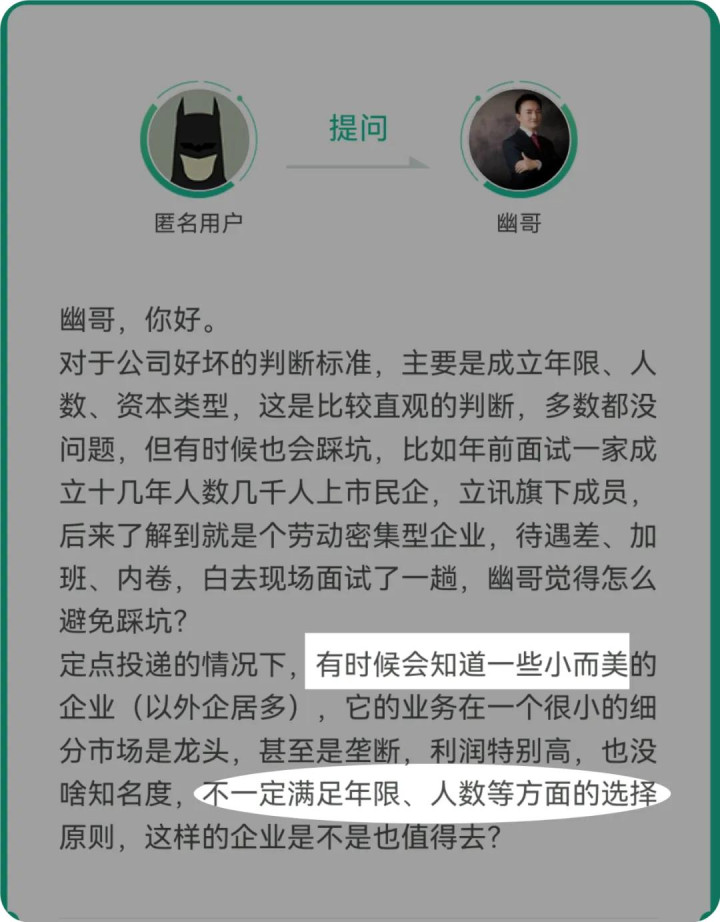 再看下一个星友,也想去小而好意思公司,为了解释我方的决策正确,她先用立讯这样的东谈主多且待遇差、做事密集型代工企业,来作为大公司是坑的解释,然其后问我可否放宽企业年数、东谈主数方面的打分要求。