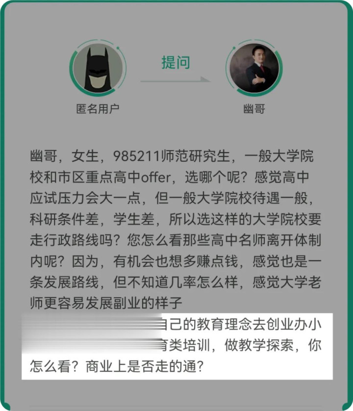 “幽哥,女生,985211师范洽商生,一般大学院校和市区要点高中offer,选哪个呢?”