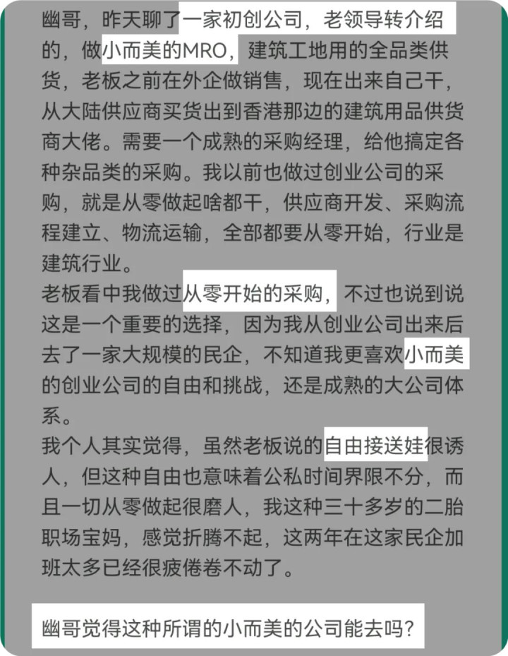 她现在被一个前带领先容的创业公司诱骗,主若是作念香港的建筑行业的MRO采购司理使命,大头兵不带东谈主,还要“从0到1搭建体系和历程”。创业公司皆心爱自称“小而好意思”的公司,她就信以为真了。这使命我认为她好意思必要去,而且难以胜任。
