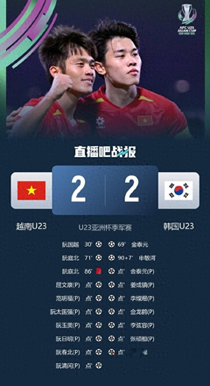 上半场阮国越首开记载,阮庭北助攻,下半场金泰元替补扳平,阮庭北率性球破门+蹬踏染红,开云体育官方网站申敏河读秒绝平,加时赛两边均无树立。最特殊球大战裴炫瑞第7轮失点,U23越南总比分9-8慑服韩国夺得本届亚洲杯季军,21点app韩国得到第四。此前,韩国队在半决赛中输给了日本队,而越南队则是在半决赛中以0-3不敌中国队。