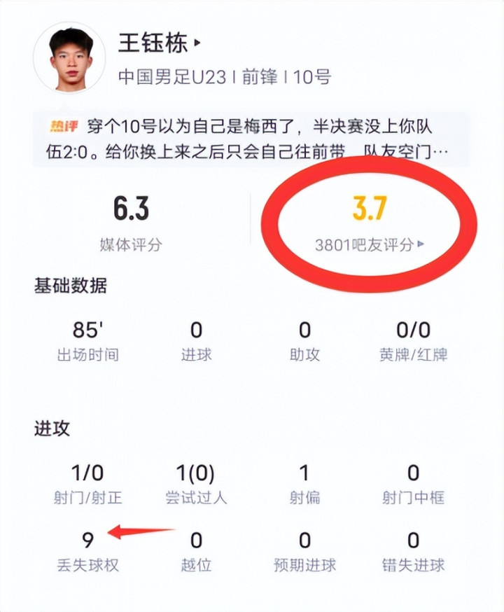 比较于其他的国足通顺员,举例李昊,徐彬等东谈主成绩的一派赞赏,以致连主西席安东尼奥皆是一派夸奖之声,全球皆在力挺安东尼奥,一定要留住带队打完此次的亚运会,皆撑抓他。只消王钰栋被许多的球迷月旦了,3.7分的得分是国足11个首发球员当中得分最低的一个。