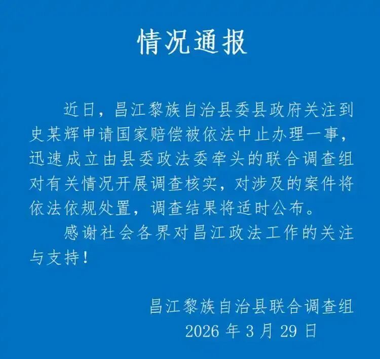 近日,昌江黎族自治县委县政府崇尚到史某辉肯求国度补偿被照章中止办理一事,马上建造由县委政法委牵头的蚁集探望组对辩论情况开展探望核实,对波及的案件将照章依规管束,探望后果将应时公布。