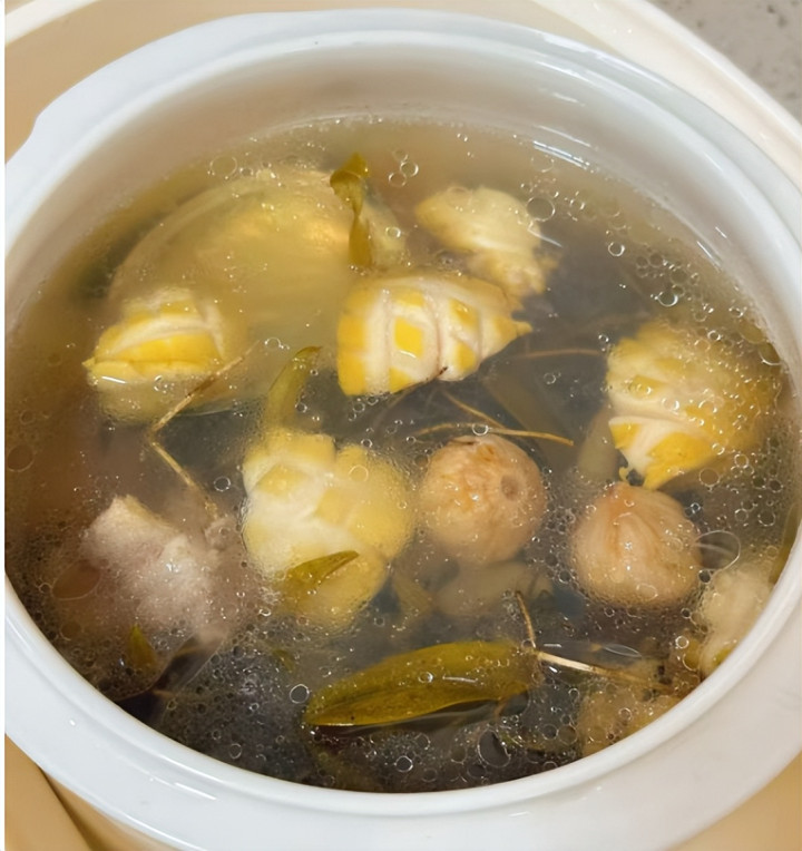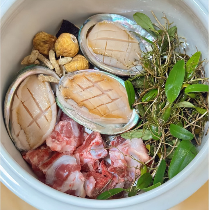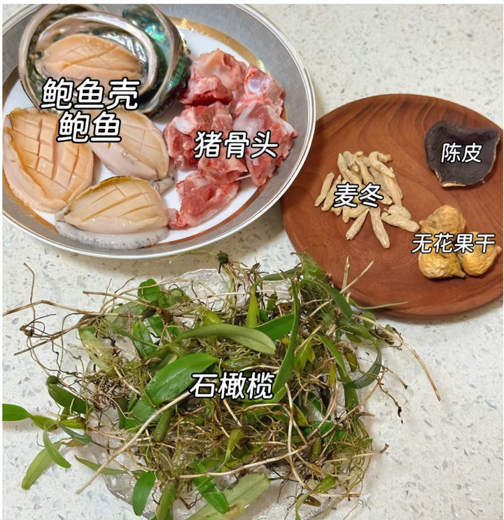 食材:石斛、猪骨、麦冬、鲍鱼、鲍鱼壳、陈皮、无花果干、陈皮。