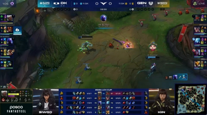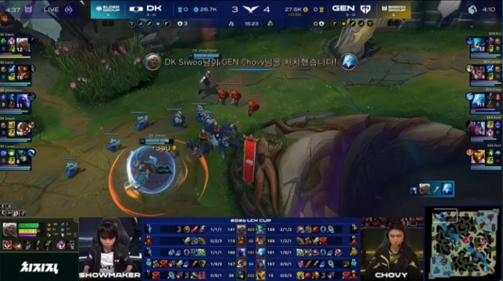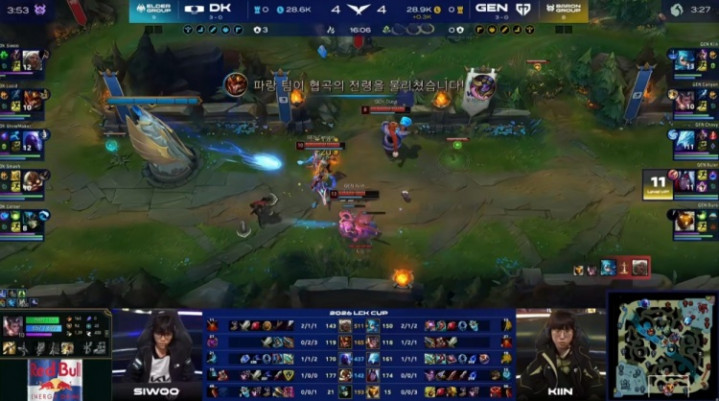 [13:15]开赴混战,Lucid皇子没闪进东说念主群先被击杀,许哥瑞兹开车来上互助队友击杀Canyon赵信,但Chovy冰鸟再后再杀许哥瑞兹,GEN打出1换2。