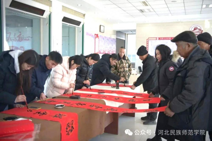 和合承德网讯(高晓东)马蹄踏雪千门瑞,对联送福暖乡村。1月22日,河北民族师范学院组织好意思术与筹办学院师生代表,赶赴承德县下板城镇李家沟村、仓子乡七家村以及平泉市青河镇营子村,拜访学校驻村使命队,并开展“送对联、传文化、暖人心”志愿做事看成,为村民现场书写并施济对联和“福”字,奉上农历马年的新春祝颂。
