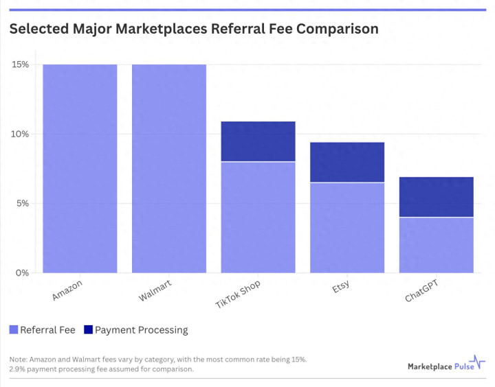 用度互异揭示了亚马逊利润抽取的边界。一个年销售额达 100 万好意思元的亚马逊卖家,仅保管曝光度就需支付约 15 万好意思元的推选费,外加 10 万至 15 万好意思元的告骤然——这两项加起来占销售额的 25% 至 30%,还不包括物流资本。ChatGPT 在 Shopify 尺度的 2.9% 支付处理费基础上,还要稀奇收取 4% 的交游费,关于一样的 100 万好意思元销售额,平台和处理用度运筹帷幄约为 6.9 万好意思元,约占总销售额的 7%。
