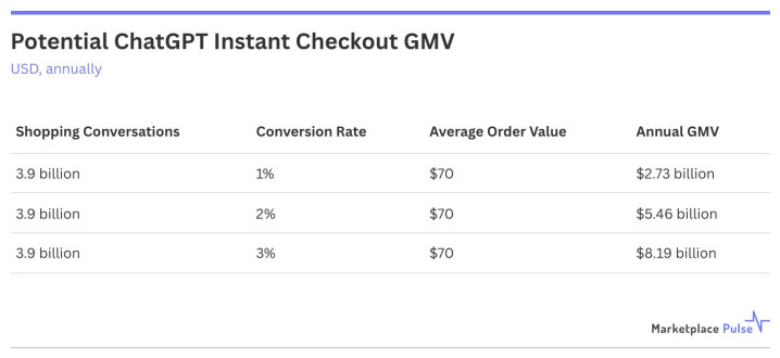 边界上的契机诚然不大,但正在增长。保守猜测,ChatGPT每年39亿次家具查询的休养率为2%,平均订单价值为70好意思元,这将产生约55亿好意思元的GMV——大致是Etsy众人阛阓边界的一半,但不到亚马逊第三方GMV(猜测为5750亿好意思元)的1% 。