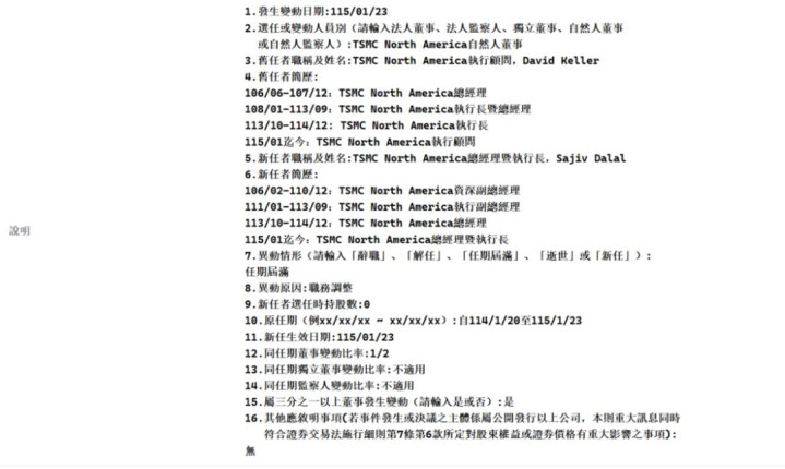 把柄公告,原任TSMC North America当然东说念主董事、并担任实施参谋人的David Keller,因任期届满卸任董事职务。Keller永久深耕台积电好意思国营运,曾于2017年至2018年间出任TSMC North America总司理,2019年至2024年9月担任实施长暨总司理,2024年10月至2025年底担任实施长,并自2026年1月起转任实施参谋人,捏续提供计策与营运漠视。
