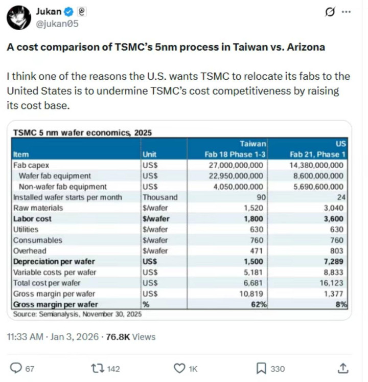 除此除外,台积电好意思国工场利润还很低。据分析师Jukan在酬酢平台上共享的SemiAnalysis汇总额据暴露,台积电在好意思国坐褥芯片将使其利润率遇到要紧亏空。台积电在中国台湾地区坐褥5纳米制程芯片与好意思国坐褥疏导家具的每片晶圆毛利率差别为62%与8%,两者收支54个百分点。其中,折旧和劳能源成本是形成相反的主要原因。