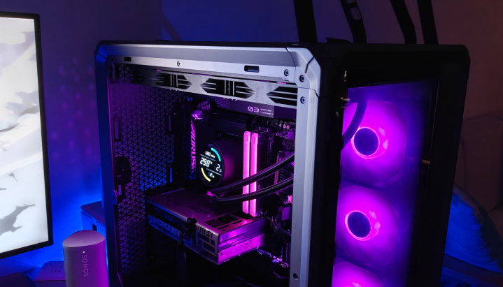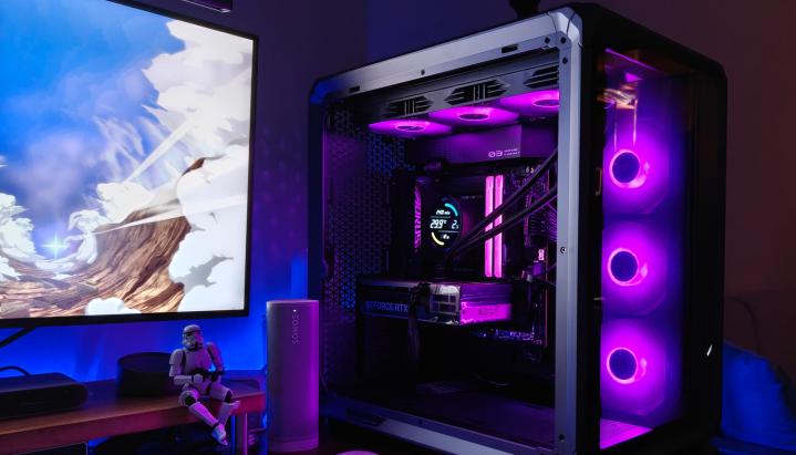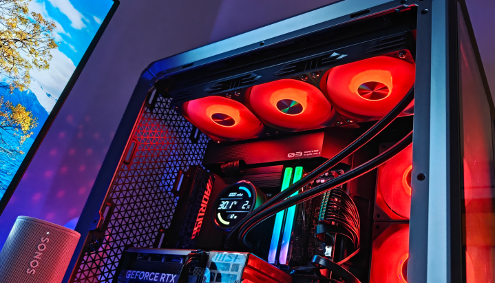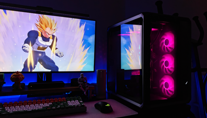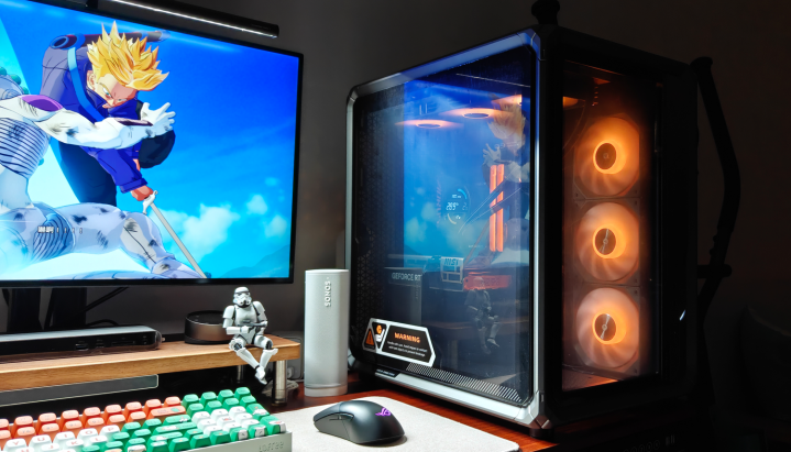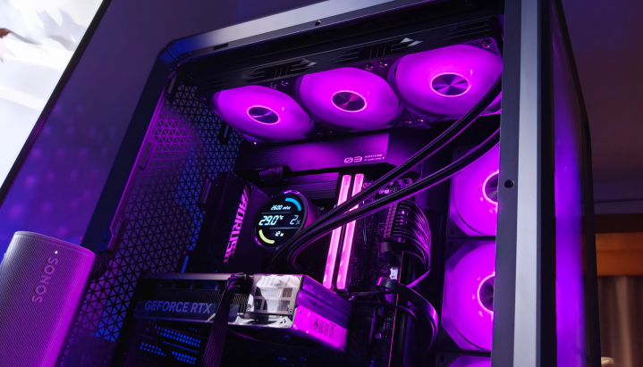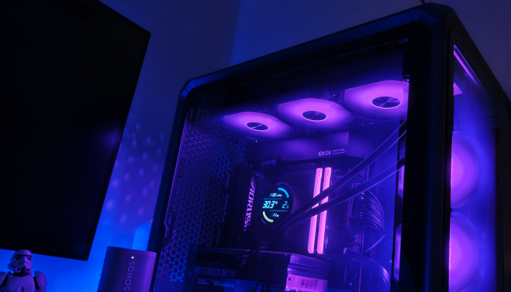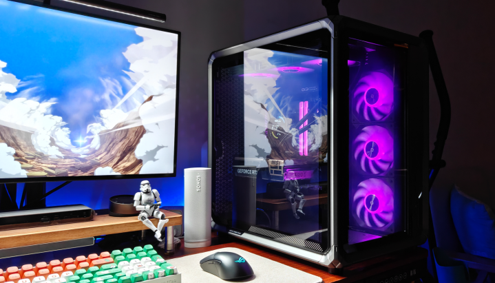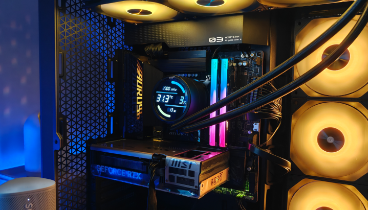机箱里面的光芒穿透网孔,在周遭投出几何光斑。当RGB灯效律动流转时,这些光斑也随之幻化出精细的渐变纹理,营造出浓郁的赛博一又克氛围。