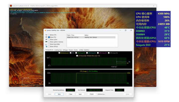 在FurMark+Stress FPU双烤测试中,系统分解端庄。CPU温度大要结识在48°C(电扇1619 RPM),显卡温度为63°C,齐备适合我对这套树立散热分解的预期。