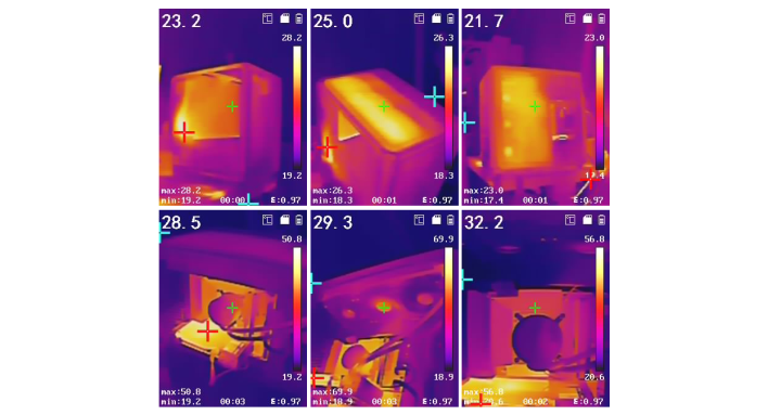 拿红外温度仪扫一圈,机箱的主要热源逼近在顶部的银昕E360 PRO冷排区域,温度读数在25°C到29°C之间。机箱两侧面板温度较低,热量主要从顶部和机箱右侧排出。