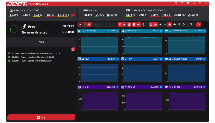 OCCT测试炫夸,CPU满载时温度在47℃,显卡温度66℃傍边,与前边的双烤得益相仿。