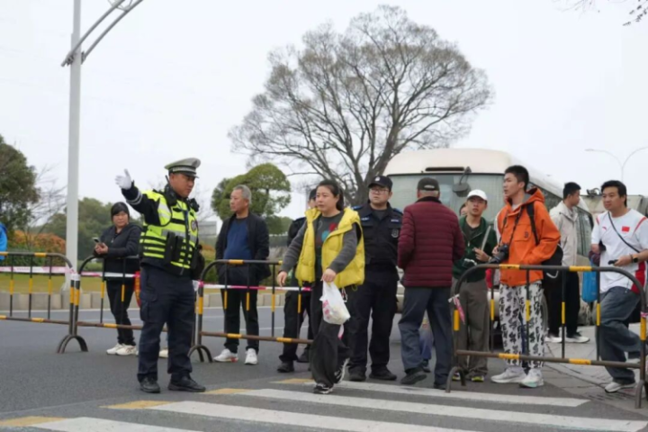 “行家别急,请往这边走。”市公安局交管支队滨湖大队民警手持指引牌,在鼋头渚景区路口一遍遍辅导。针对沿线旅馆聚首、市民赏花出游重叠的情况,无锡公安交管部门提前制定绕行决议,并在沿领路口部署执勤警力,为人人出行提供及时交通引导等处事。