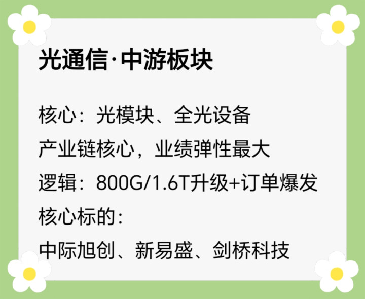 1. 上游国产替代:优先布局光芯片、光器件龙头,把捏时候冲破红利;