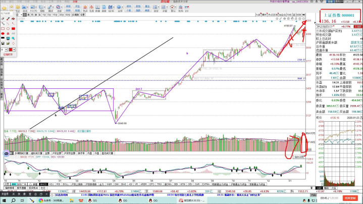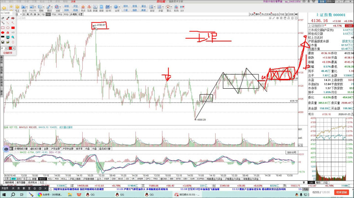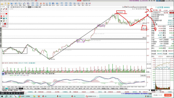 这是上证指数,固然要是这是表面是需要走出离开段,不走出离开段何如样?不走出离开段也莫得问题,关联词弗成跌破四千一百二十点,跌破四千一百二十点也就意味着三十分钟结构一笔高潮,到这个位置就铁心了,后头要走三十分钟结构的着落,一朝出三十分钟结构着落,这个钟数我个东谈主认为是扛不住的,朝下去看四千一。