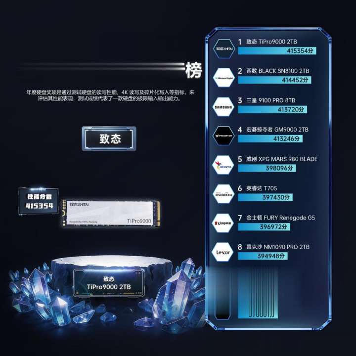在电脑硬件赛说念,1月23日晚最硬核的一幕,莫过于 致态 TiPro9000 问鼎“年度最强电脑硬盘性能”奖。这款基于自研晶栈 Xtacking 4.0 架构的 PCIe 5.0 固态硬盘,实测法规读取速率尽然破裂了 14000MB/s。