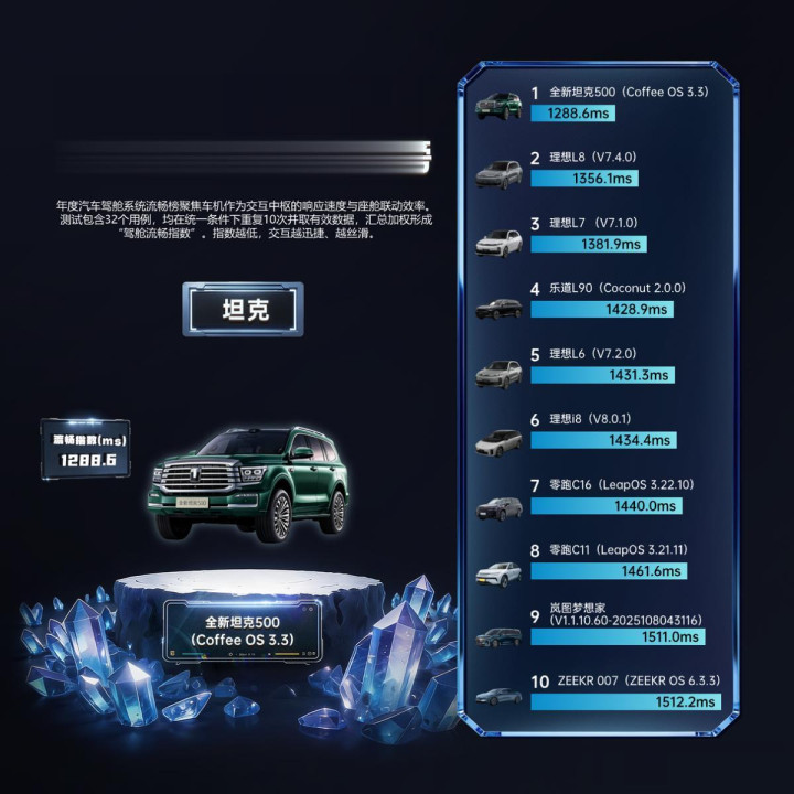 在出行鸿沟,存储费解雷同是车机卡顿的隐形杀手。1月23日晚,全新坦克 500(Coffee OS 3.3) 以 1288.6ms 的指数拿下畅通大奖,其背后是针对车载舆图加载、多媒体大数据费解进行的专项优化。即使在离线舆图大数据量交互时,系统也曾能保持如丝般顺滑。