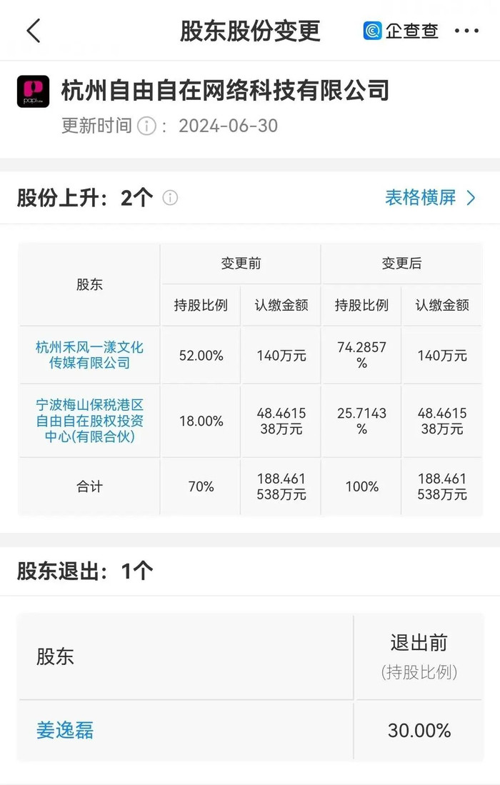 企查查APP显露,2024年5月,姜逸磊领先卸任papitube运营主体北京春雨听雷采集科技有限公司董事职务,退出一齐责罚岗亭。同庚6月底,开云体育app官方最新版其又退出papitube母公司杭州解放从容采集科技有限公司鼓动行列,退出前捏股30%,至此完成股权与责罚层面的全面解绑。当今,papitube由其合资东说念主杨铭主导运营。