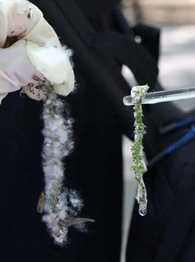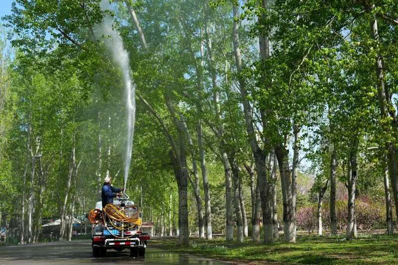 北京市园林绿化科学磋商院系统立异的杨柳飞絮凝絮剂,为无毒无害的环境友好型高分子有机物,适配高压雾炮车,无东说念主机等多种喷施诞生。药剂喷施后,可在树冠名义酿成一层“生态膜”,使行将炸裂的果絮黏结磨蹭,失去飞翔身手,单次喷施即可使单株杨柳雌株飞絮飘散量减少三分之二以上,就像是给飞絮穿上了一个黏性的“谨防套”。